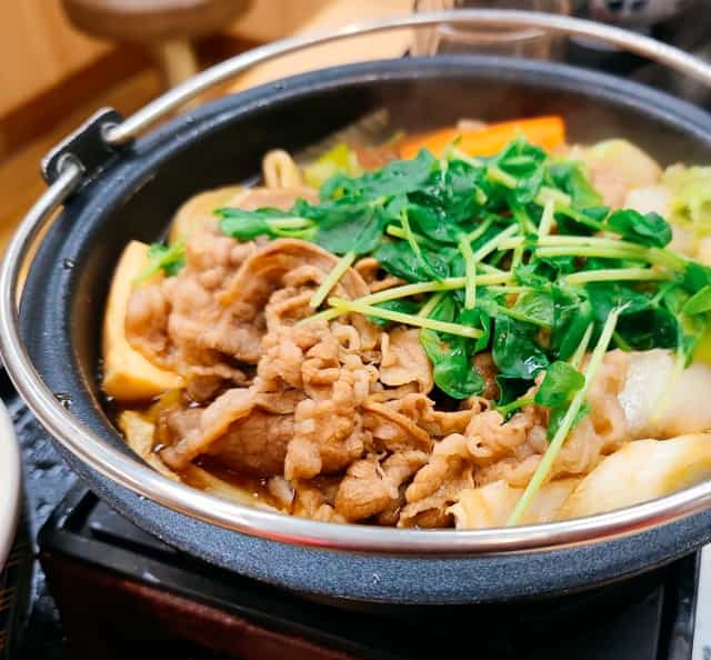 ①牛すき鍋膳を肉2倍、ご飯大盛りで注文する